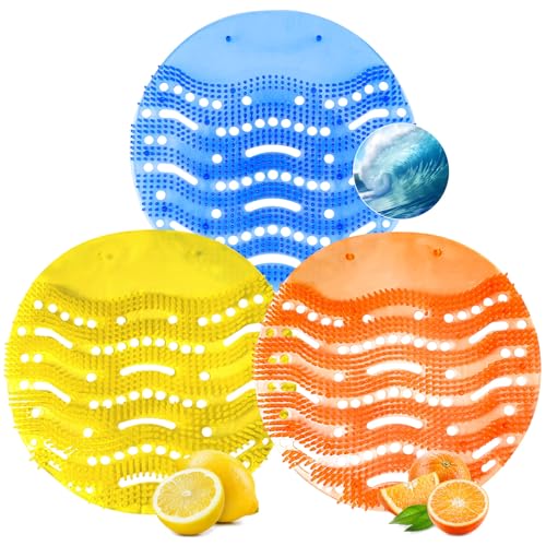 - 【12 Pack Urinal Screen Deodorizer】3 Different Scents & Colors. 4x Blue – Ocean Breeze Scent & 4x Yellow – Lemon Scent & 4x Orange – Orange Citrus Scent, Each urinal screen is individually packaged.